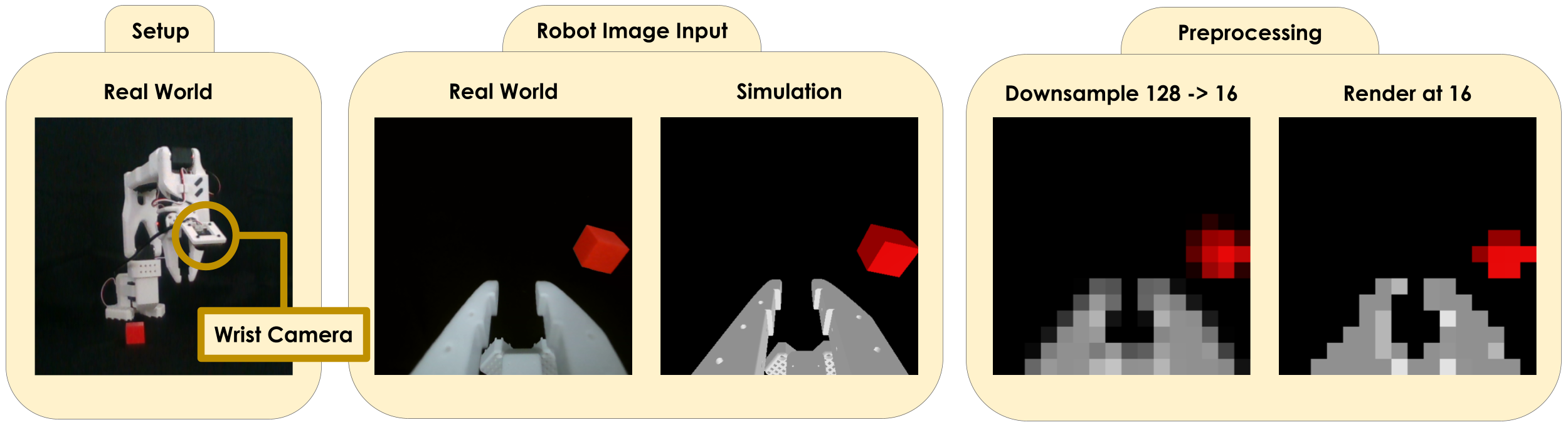 (Left) We use a single wrist camera, our real world setup is displayed on the left.